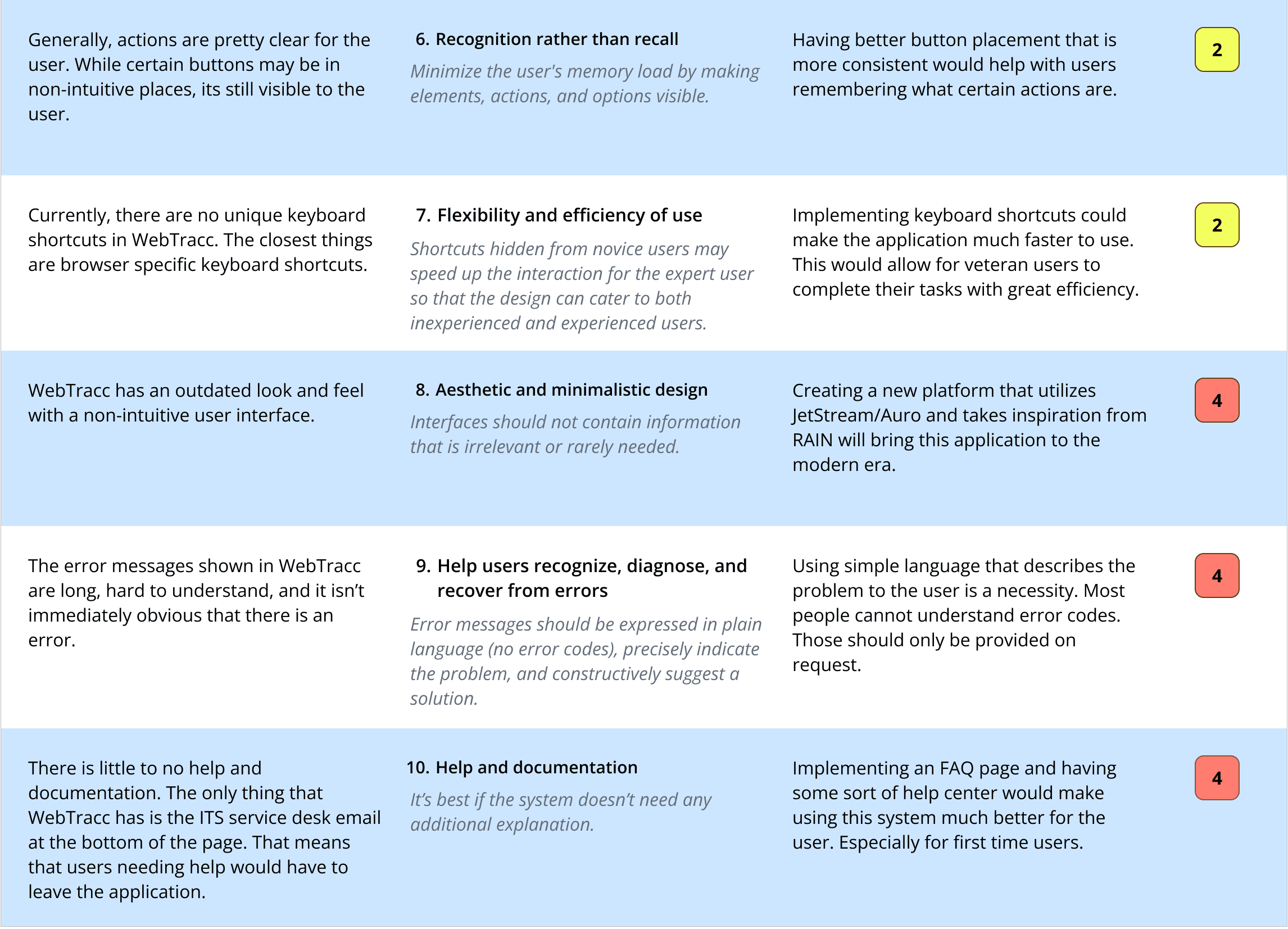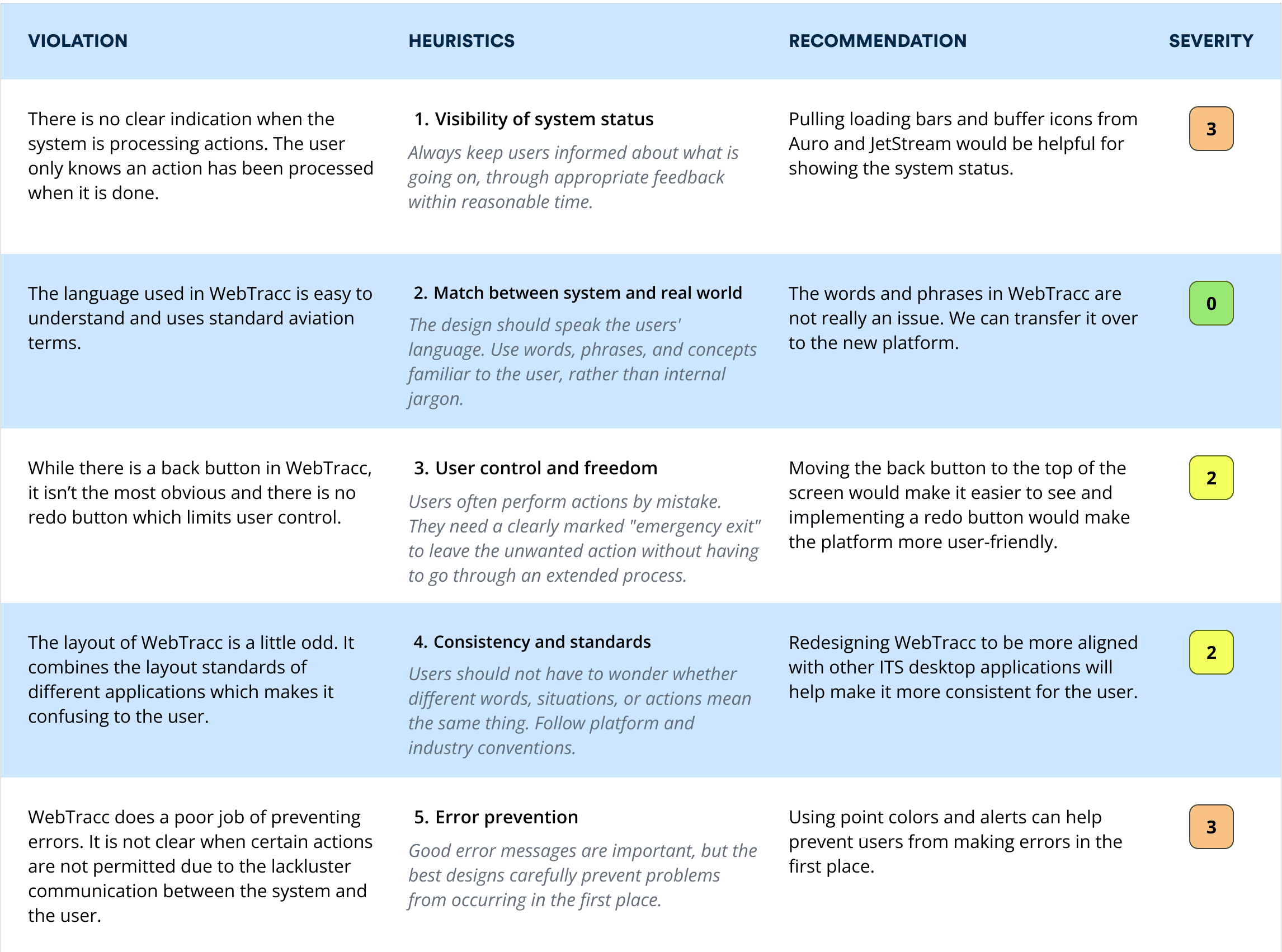 To understand the limitations of WebTracc, I performed a heuristic evaluation scoring usability issues on a 0–4 scale. The results revealed significant problems in navigation, error prevention, and information hierarchy. Several areas were flagged as being high‑priority issues. These findings highlighted the core areas the new product would need to address.