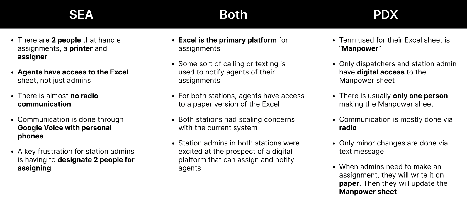 I visited both the Seattle and Portland airports to observe workflows and interview admins and ramp agents. Both airports rely heavily on Excel for personnel availability, but differ in how they divide roles and communicate. I learned that personal phones, Google Voice texting, and verbal updates fill gaps that a unified system could solve.